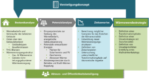Zunächst ist festzuhalten, dass zur Kommunalen Wärmeplanung laut Wärmeplanungsgesetz, keine Umsetzungspflicht der Ergebnisse besteht. Diese dienen lediglich als Leitfaden für die energetischen Planungsprozesse. Der Ablauf ist dabei festgeschrieben und beinhaltet eine Analyse des Bestandes, das Aufzeigen von möglichen Potenzialen zur Einbringung erneuerbarer Energie, die Untersuchung von Zielszenarien, sowie das Entwickeln einer Wärmewendestrategie.