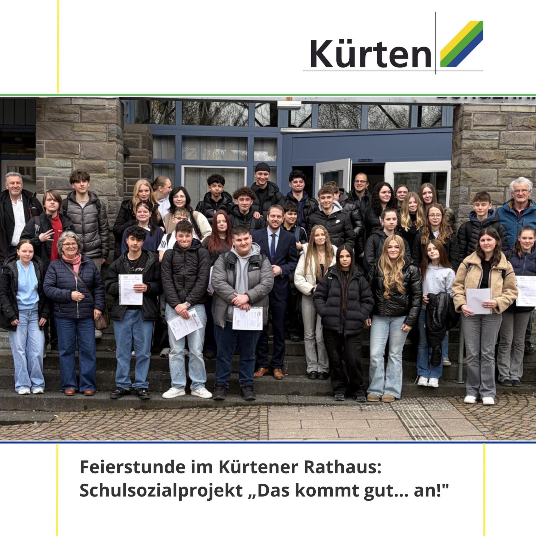 Im Rahmen einer Feierstunde im Rathaus Kürten wurden am 5. Februar 2026 49 Schülerinnen und Schüler der Gesamtschule Kürten für ihre erfolgreiche Teilnahme am Schulsozialprojekt „Das kommt gut… an!“ ausgezeichnet. Bürgermeister Mario Bredow überreichte die Zertifikate und würdigte das besondere Engagement der Jugendlichen.