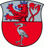 „In geteiltem Schild oben in Silber ein zwiegeschwänzter, blau bewehrter und gekrönter roter Löwe, unten in Rot ein silberner Fischreiher, der einen silbernen Fisch im Schnabel trägt.“