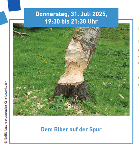 Der fleißige Baumeister ist aber tatsächlich in Leverkusen an Dhünn und Wupper sehr aktiv. Am Ufer entlang der Dhünn hat er deutliche Spuren hinterlassen. Diese wollen wir auf einer Exkursion entdecken. Nebenbei erfahrt ihr Interessantes über den Lebensraum und die Lebensweise des Bibers.