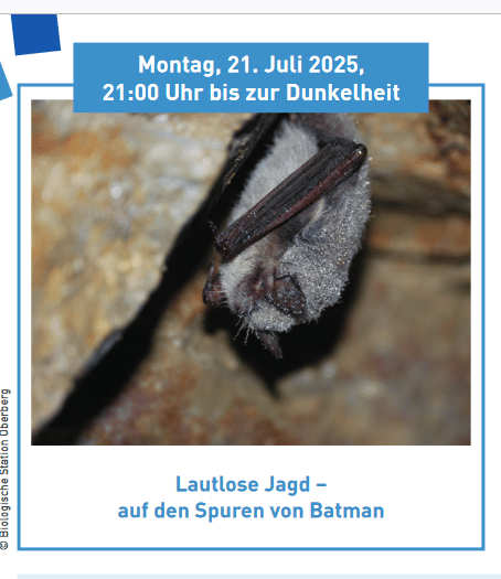 Der lautlose Flug der Fledermäuse im Dunkeln – ein Phänomen, das viele Menschen fasziniert. Das Vorkommen der Tiere in unserer unmittelbaren Nachbarschaft ist jedoch häufig unbekannt. Über einem Gewässer suchen wir die Tiere in der hereinbrechenden Dunkelheit. Mit Hilfe eines sogenannten „bat-detectors“ ist es möglich, die Ultraschalllaute in für den Menschen hörbare Töne zu verwandeln. Neben dem Beobachten erfahren wir im lockeren Austausch auch Spannendes über diese faszinierenden Tiere.