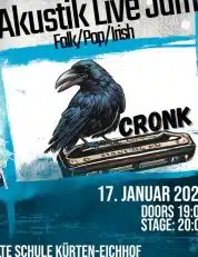 Cronk – das sind Dieter, Tobi, Matthes und Raphael. Mit Gitarre, Kontrabass, Gesang und Cajón bringt die Band akustische Coverstücke auf die Bühne. Ihr Repertoire reicht von mitreißendem Irish Folk über eingängige Pop-Songs bis hin zu rockigen Klassikern – immer handgemacht, authentisch und mit viel Spielfreude.