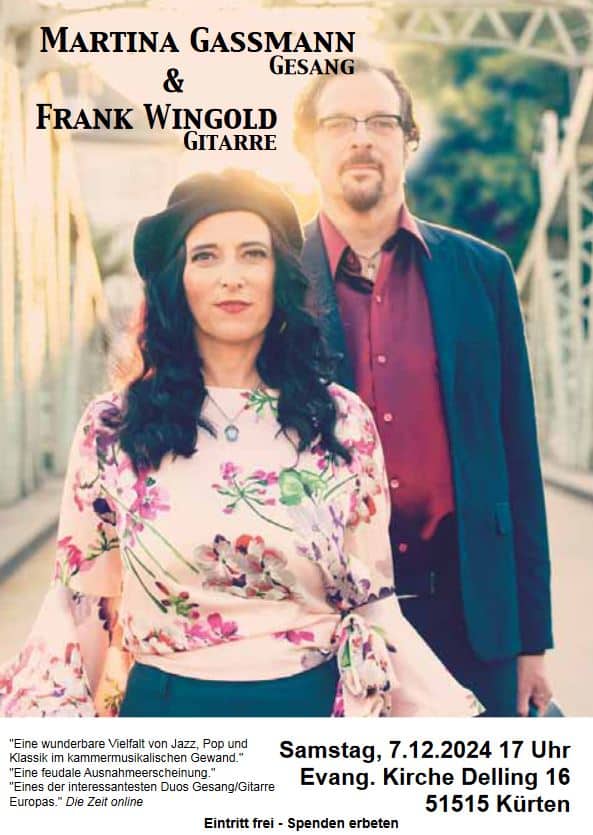 Das Duo Gassmann & Wingold geben am Samstag, 7. Dezember, 17 Uhr, in der Evangelischen Kirche Delling ein Konzert. Auf dem Programm steht eine bunte Mischung aus Jazz, Pop und Klassik, vorgetragen mit Gesang und Gitarre.